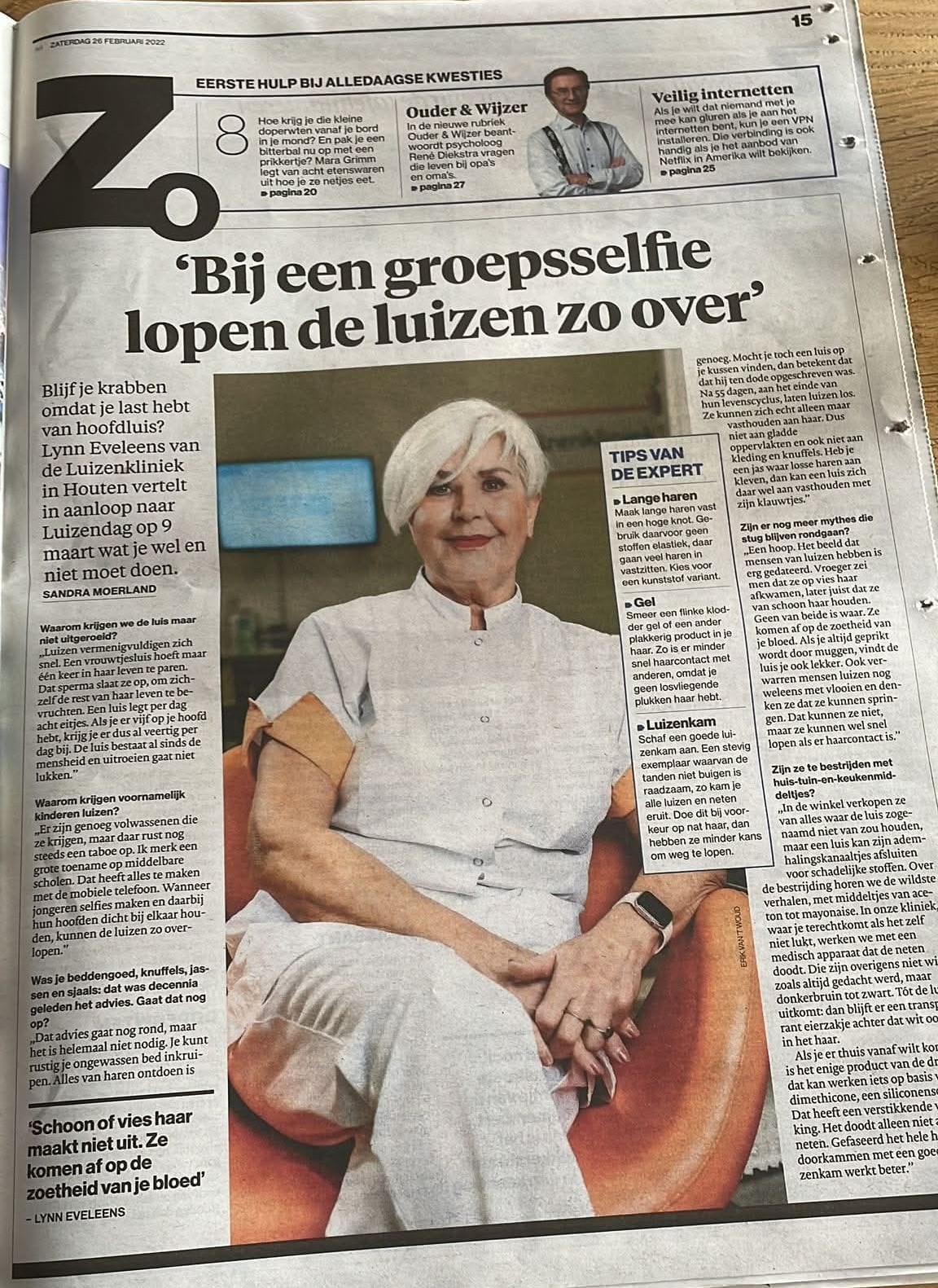 Lynn Eveleens, hoofdluisspecialiste van de Luizenkliniek Houten in de krant het AD